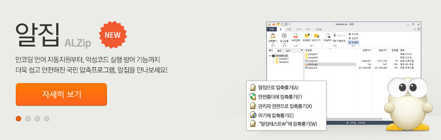 알집은 우리가 잘 아시다시피 압축된 파일을 풀기도 하고 그리고 파일들을 압축해서 용량을 줄이는 역할을 하게 됩니다. 그리고 많은 파일들이 인터넷 웹상에 업로드될 때 압축이 되어 올라오게 됩니다. 우리는 그 압축 파일을 풀기 위해서 알집이 필요하기도 하고요.