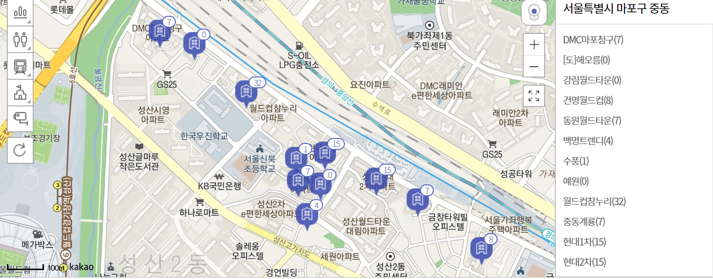 저는 일단 마포구 중동을 들어가보았습니다. 그리고 여기서 일단 각각 부동산 아파트 명칭들이 나오게 됩니다. 각각 아파트옆에 있는 숫자는 실제로 현재의 매매 전세, 월세 등의 나와있는 것을 보고 알수가 있습니다.
