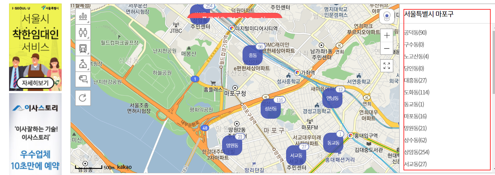 마포구 기준으로 각각의 동이 많이 있는 것을 보실수가 있습니다. 공덕, 구수동, 당인동, 대흥동, 망원동, 마포동 등등 나오는데요. 저는 이중에서 한곳데를 확인하고 들어가보도록 하겠습니다.