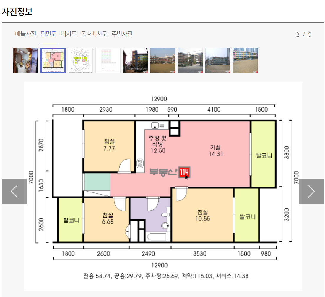 각각의 실사진 및 평면도 사진 그리고 옆에 각각의 아파트, 공원, 학교 부지등이 나오게 됩니다.