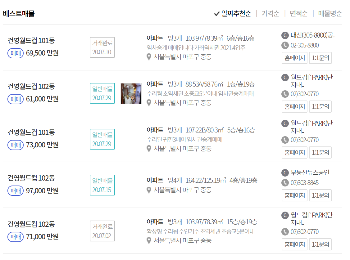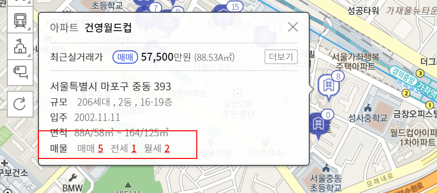 부동산114 아파트 시세 조회 해보면요. 기본적으로 건영 월드컵 아파트 부분을 눌러 보았습니다.