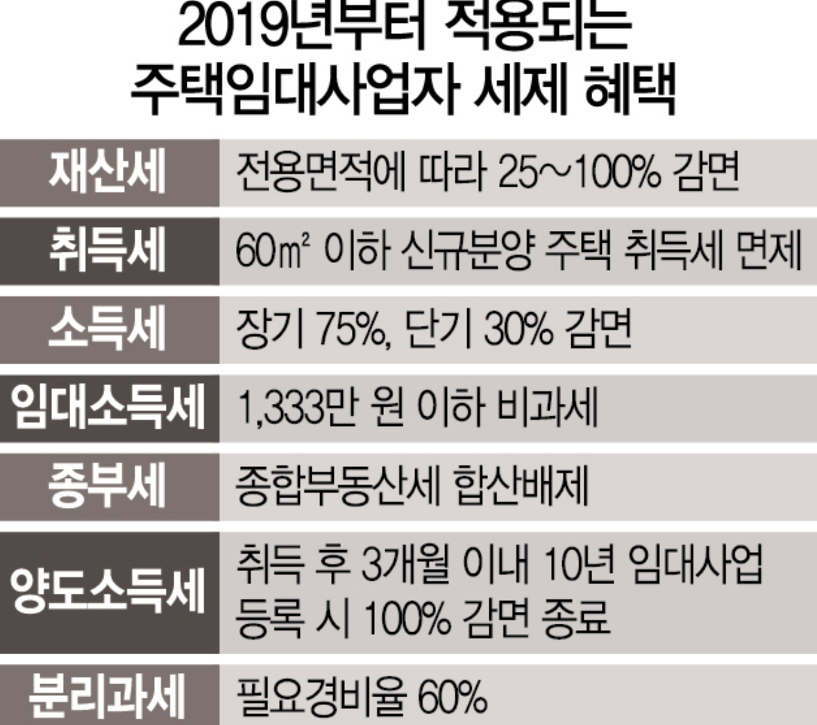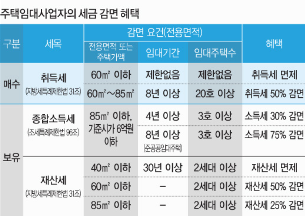 - 재산세: 부동산 임대사업자의 경우는 과세표준에 에 대한 개별과세이지만 주택임대사업자의 경우는 40 이하는 면제 60 이하는 50% 감면입니다.