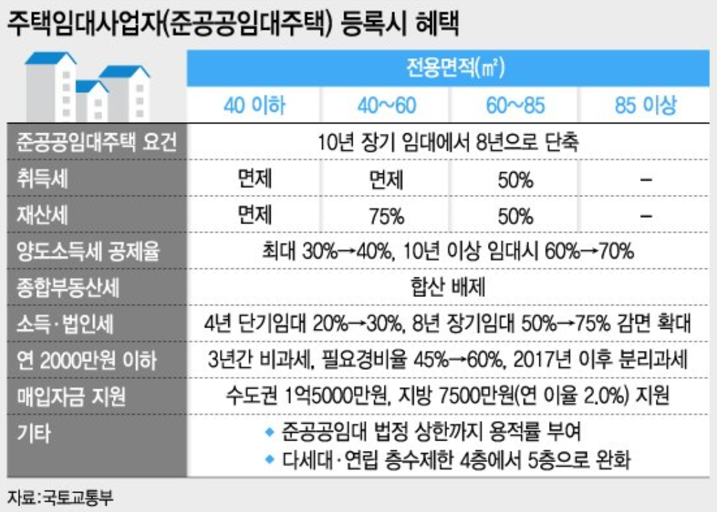 준준공공임대주택 요건, 취득세, 재산세, 양도소득세 공제율, 종합부동산세, 소득, 범인세, 연 2000만 원 이하인 경우 매입자금 지원 등을 혜택을 해줍니다. 자료의 경우는 국토교통부에서 재시하고 잇는 정보들입니다.