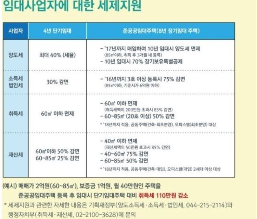 일단 또 도표를 보시게 되면 예를 들어서 하나 말씀드릴게요. 임대사업자의 경우는 매매가 2억 원 보증금 1억 월 40만 원인 주택을 준공공임대 주택을 등록한 후 임대하게 된 경우에는 단기 임대 주택 대비 취득세가 110만 원 감소한다고 합니다.