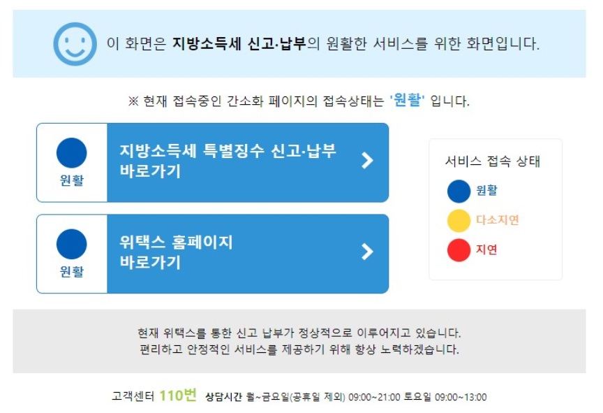 구글, 네이버, 다음 그 어떤 곳도 상관이 없습니다. 검색하신 후에 위택스로 이동을 하셔도 되고요. 아니면 제가 주소를 올려놓도록 하겠습니다. 참고를 해보셔요. 또한 일단 접속해서 들어가면 되는데요. 간소화 시점에서는 서비스 접속상태가 나오는데요. 이는 원할, 다소 지연, 지연 등으로 구분이 된다고 보면 되겠습니다.