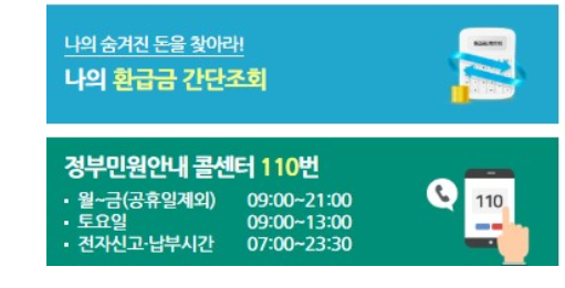 간소화 서비스 기간에는 일단 이러한 화면이 보이지만 그 이외에는 바로 접속이 가능합니다. 그리고 일단 기본적으로 지방소득세 특별징수 및 그리고 신고, 납부 바로가기이며 그리고 일단 고객센터 번호는 110번이고 또한 상담시간이라면 월~금요일( 공휴일 제외)이며 또한 9시부터 오후 9시까지 가능합니다.