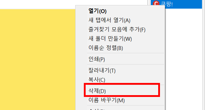 참고로 쿠팡 바로가기 삭제 부분을 추가적으로 알아볼텐데요. 일단 바로가기 아이콘이 있는 곳에서 좌클릭을 해주고 나서 삭제 부분을 찾아주시기만 하면됩니다. 그리고 억지로 시작페이지가 변경이 된경우도 있을텐데요. 이는 시작페이지 변경하는 법을 찾으셔서 하시면 되겠습니다.