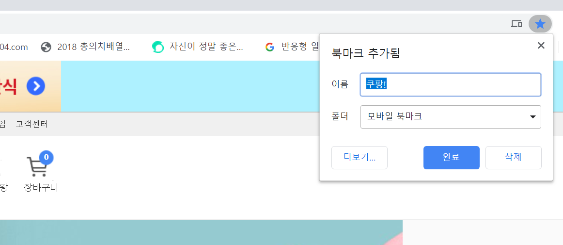 일단 북마크 추가됨을 보시게 되면 쿠팡이라고 써진 것을 볼 수가 있고, 완료라고 써진 버튼을 누르면 이제는 북마크 부분을 누르셔서 바로 쿠팡 쇼핑몰 바로가기가 이루어질 수가 있으니 참고하시기 바랍니다.