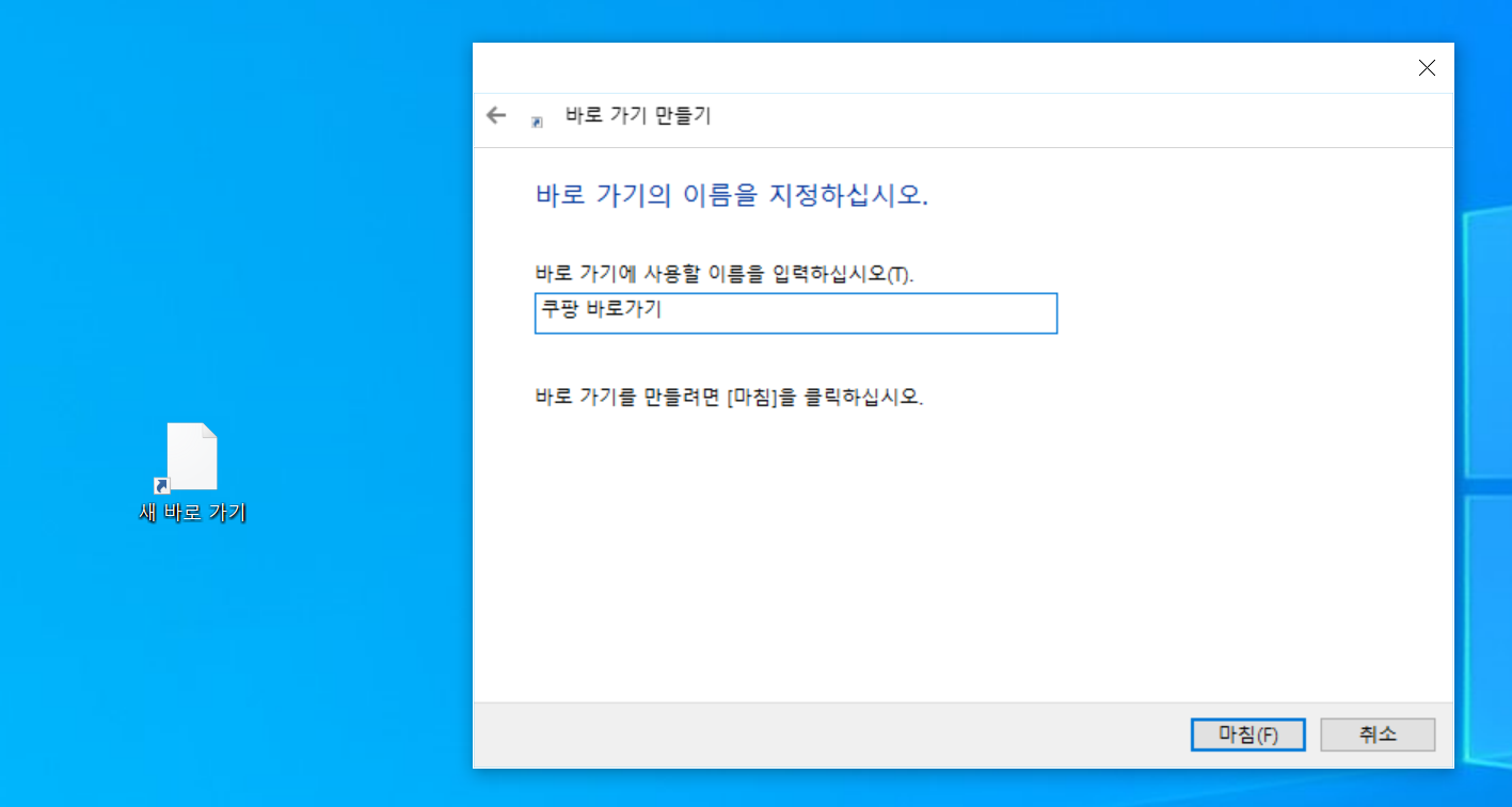 쿠팡 바로가기 입력한 후에 마침을 눌러주면 완성이 됩니다. 실제적으로 이 부분은 자신만의 아이콘 이름을 설정하는 부분이기 때문에 그 무엇을 쓰셔도 상관은 없습니다. 이렇게 되고 만들어진 아이콘을 살펴보도록 할까요?