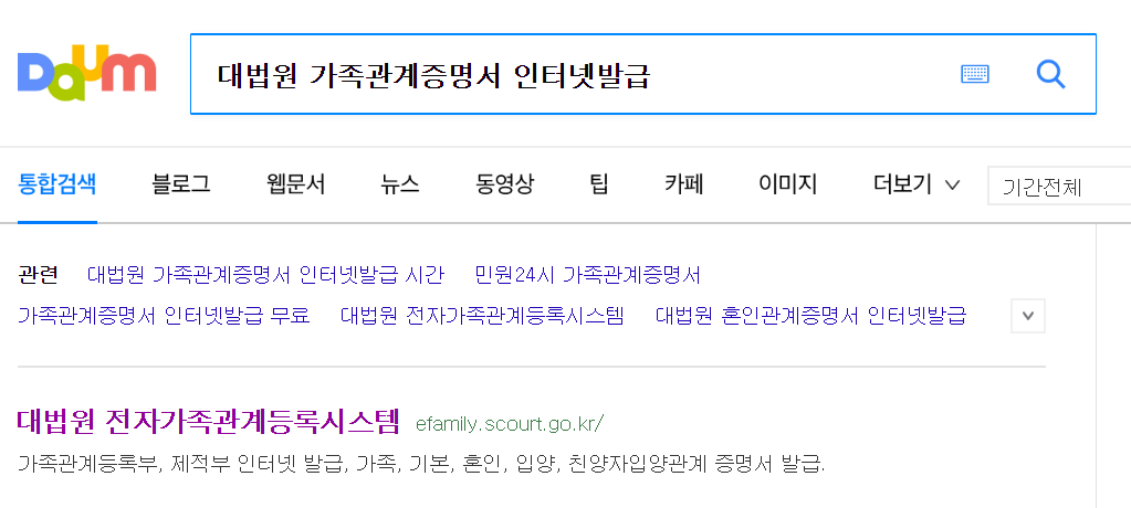 ▲ 대법원 전자가족관계등록시스템이라는 사이트가 있습니다. 주로 여기서 모든 열람과 발급과정이 이루어집니다. 그렇기 때문에 일단 저희는 편하게 보시라고 대법원 가족관계증명서 인터넷발급 검색어를 쳐보았습니다. 뭐든 상관없습니다. 저부분이 나오기만 하기 때문이죠.