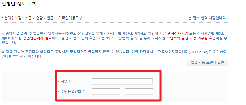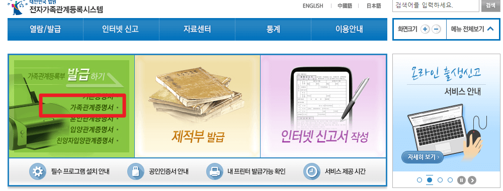 ▲ 그럼 프린트 모양으로 뜨게 되는데요. 보면 2번째 메뉴에 바로 가족관계증명서 라고 쓰여진 부분이 있습니다. 우리가 해야하는 메뉴이니 바로 클릭하고 들어가시면 됩니다. 대표적으로 우리가 이런 가족관계증명서를 발급받을때는 각종 수급자격이나 돈을 빌리거나 아니면 신분 증명하기 위해서 아니면 의료비를 지출하고 다시 돈을 받을때 등 다양하게 쓰이게 되죠.