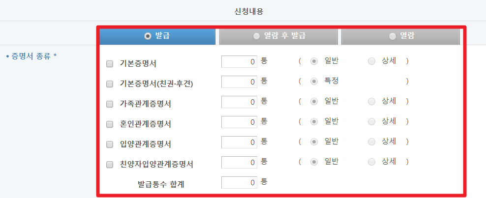 ▲ 신청내용은 우리가 이중에서 가족관계증명서 인터넷발급 하기 위한 것이니 일단 3 번째 보이는 가족관계증명서를 선택해서 체크 한뒤에 1통 으로 체크 하고 옆에 일반과 상세라는 부분은 상세를 선택하고 되면 주민등록번호가 함께 복사되는것을 뜻하니 참고하시면 되겠습니다.