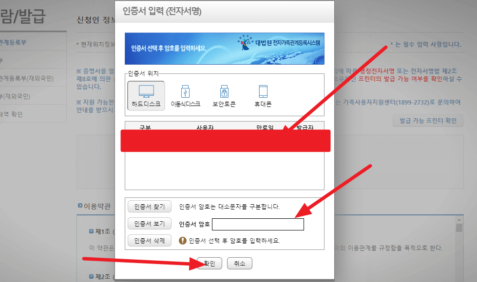▲ 일단 화면을 보시면 아시겠지만 공인인증서 이제 확인 부분이 나오게 됩니다. 일단 공인인증서는 자신의 컴퓨터의 깔린 인증서를 선택하고 암호만 입력하면 되는 부분이지만 한번도 이용해 본적이 없는분들은 약간 골치 아플수도 있습니다. 그러니 공인인증서 설치가 준비물이라고 했던 부분이기도 합니다. 다입력하고 나면 밑에 확인 누르시면 되겠습니다.