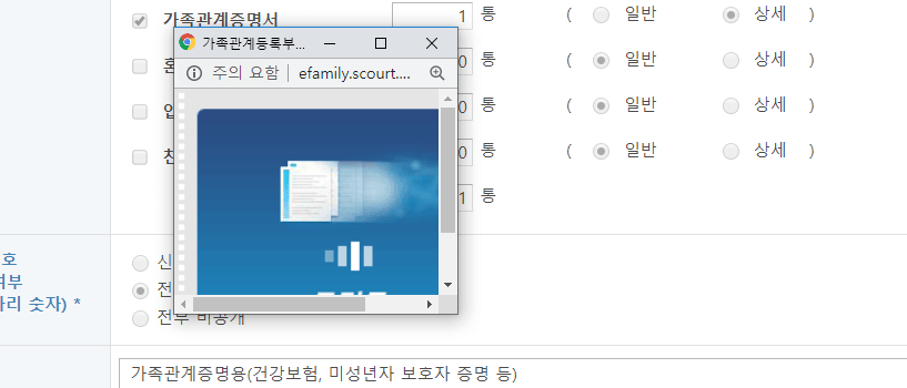 ▲ 버튼을 클릭하면 이제 가족관계증명서 부분을 프린트 쪽으로 정보를 넘겨주기 위한 작은 창이 뜨게 됩니다. 이부분은 떳다가 알아서 사라지니 잠시만 기달려주시면 되겠습니다.