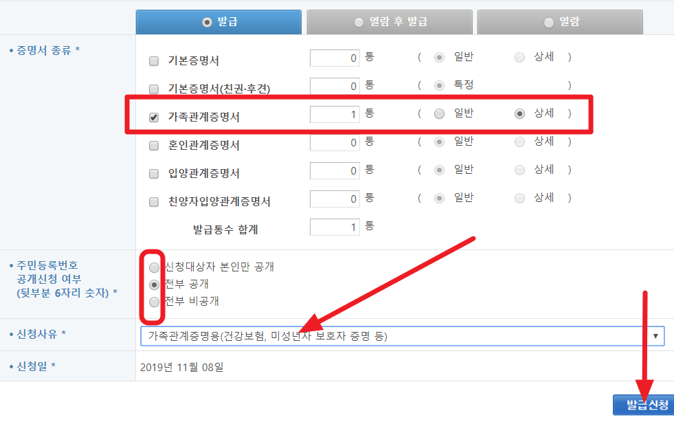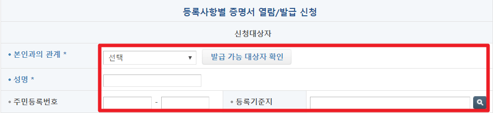 ▲ 이제는 발급받기 위해서 몇가지 선택해야하는 사항이 있는데요. 일단 본인관의 관계부분을 선택하시면 되는데요. 본인으로 선택을 하게 되면 나머지는 자동으로 입력이 됩니다. 자신이 아니라 자녀등을 입력한 경우에는 다시 몇가지를 입력해주셔야합니다.