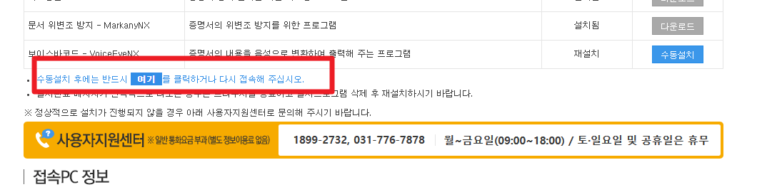그러면 하나씩 살펴보도록 하겠습니다. 일단 수동설치 후에는 반드시 여기를 클릭하거나 다시접속한다라는 부분을 확인하시고 클릭 해주세요.