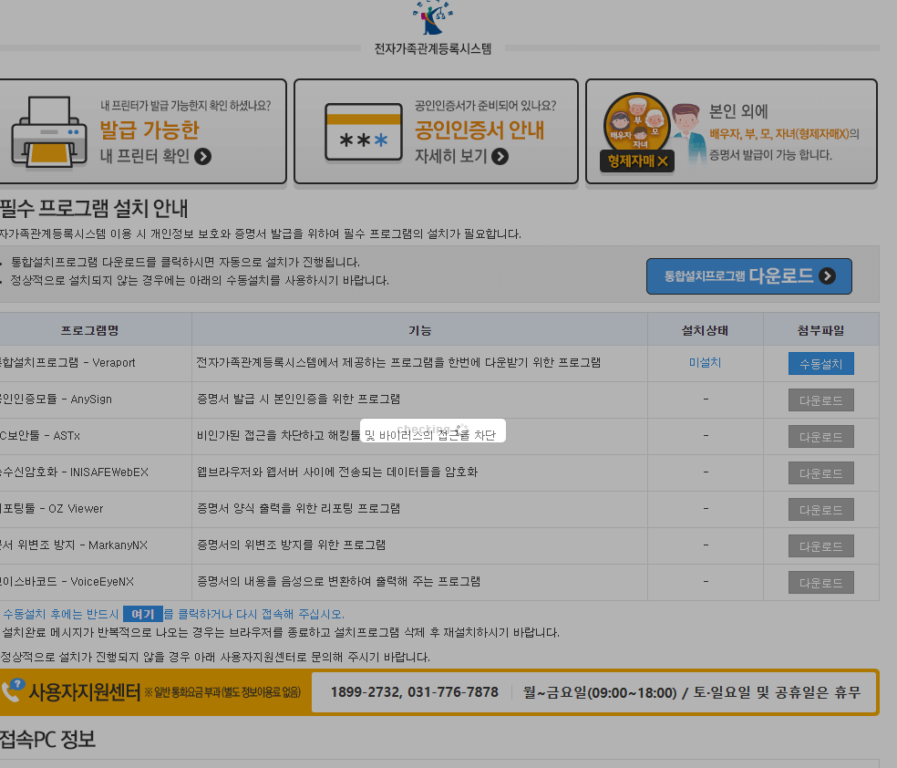 ▲ 일단 접속을 하게 되면 보안프로그램부터 설치를 해야하는데요. 이곳은 우리나라의 개인 신분을 증명하고 가족관계등을 인정해주는 곳이기 때문에 기본적인 쉽게 접급해서는 안되겠죠. 어떻게 악용이 될지도 모르는 일이기 때문에 자신임을 분명히 확증을 해야해서 공인인증서도 필요하게 된거겠죠.