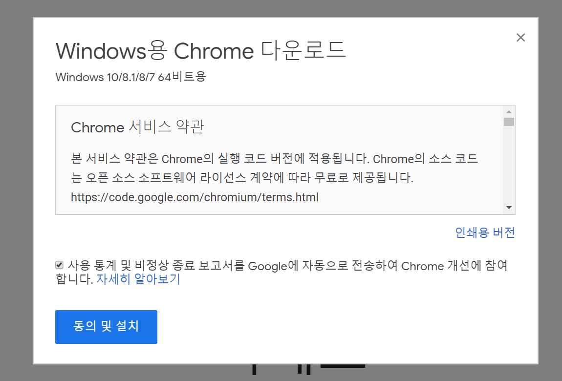 그리고 다운로드를 누르게 되면 윈도우용 크롬브라우저 다운로드 창이 열리게 됩니다. 그리고 크롬의 서비스 약관을 잠깐 보시고 동의 및 설치 클릭하고 넘어가면됩니다. 그리고 일단 구글에서 크롬의 업그레이드를 위해서 자동으로 정보를 옮긴다고하는데요. 일반유저들은 동의 해도 되고 그렇지 않는 사람들은 해체 하셔도됩니다.