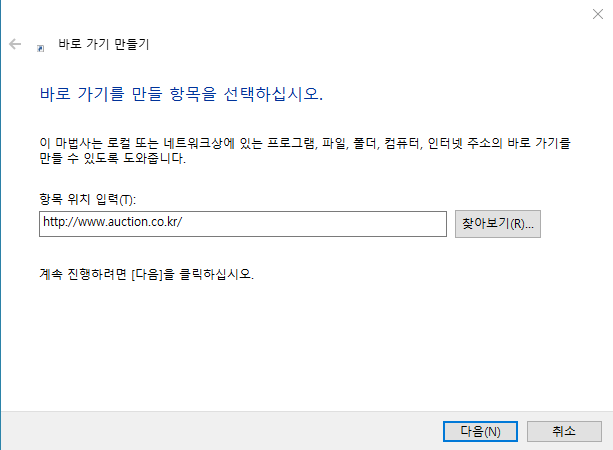 바로가기 만들기 메뉴가 뜨게 됩니다. 항목 위치 입력이라는 부분이 보입니다. 이는 실제로 컴퓨터에 있는 각종 파일들을 바로 실행시키기 위한 메뉴인데 여기에 인터넷 주소가 입력이 되면 즉 옥션 바로가기 아이콘이 되는 것입니다. 그렇다면 옥션의 주소를 아는 것이 필요로 하겠죠.