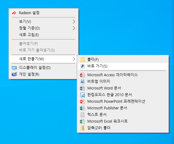 바탕화면에서 일단 새로 만들기를 클릭하시고 옆으로 새로운 메뉴가 뜨게 되면 이때 바로가기를 클릭해주시면 됩니다. 여기까지는 다들 쉽게 따라 할 수 있을 거라는 생각이 듭니다. 그러면 이제 새로운 창이 뜨게 되는데 당황하지 마시고 따라와 주시면 바로가기 아무리 초보도 30초면 만들기가 가능합니다.