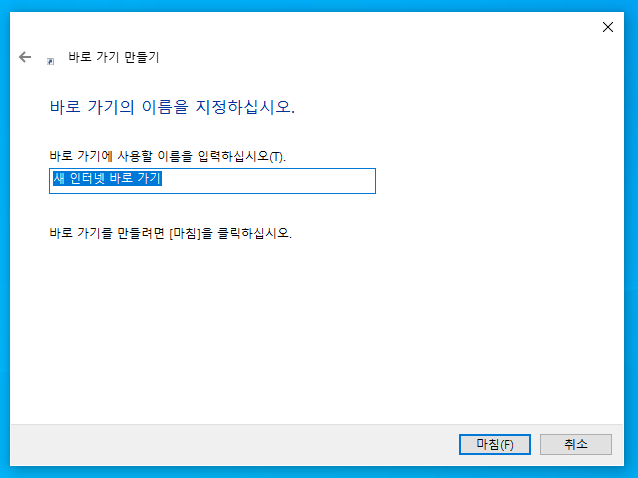옥션바로가기 주소 입력 후 다음을 누르게 되시면 아제 아이콘 이름을 정하는 부분이 나오는데요. 사진과 같이 바로 가기에 사용할 이름을 입력하십시오 라고 나옵니다. 말 그대로 여기에다가 우리가 원하는 옥션 바로가기 라고 입력후 마침을 누르면 되겠습니다.