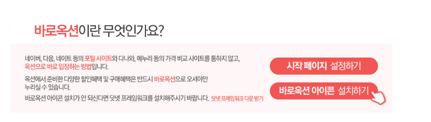 바로옥션이란 일단 바로옥션 아이콘 설치하기가 되는데 이 부분이 바로 저희가 했던 부분을 일괄적으로 해주는 시스템 이기는 합니다. 그러나 잘못했을 시 여러 가지가 설치가 될 수가 있고 닷넷 프레임워크가 없다면 추가적으로 다른 설치가 필요로 함으로 위의 방법을 먼저 해보시고 여기로 오시기 바랍니다.