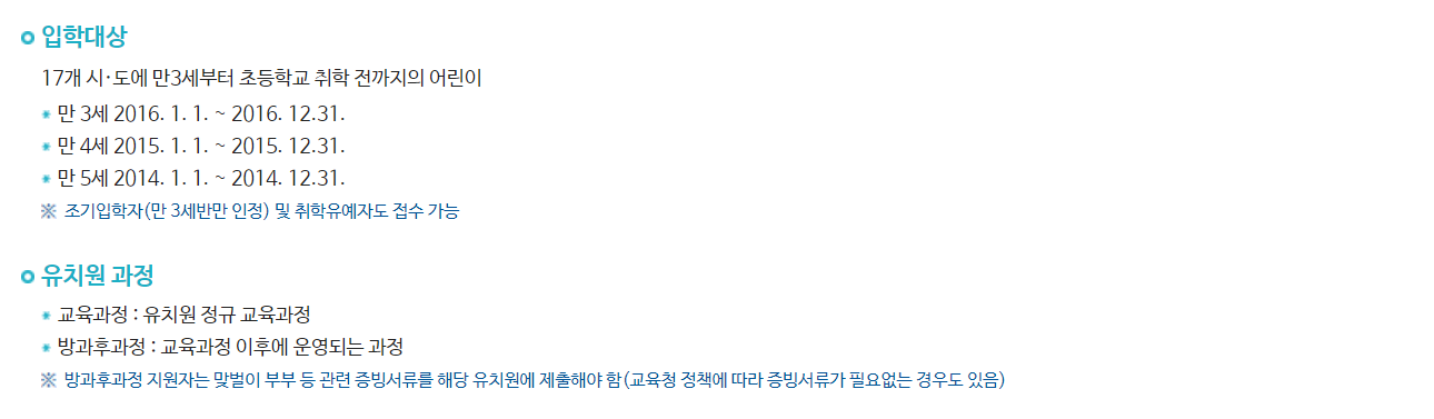 일단 만3세 부터 시작해서 만 5세까지 정말 많은 여러 가지 부분으로 조기입학자만 소개가 가능합니다. 유치원 과정 자체가 정규 교육과정이고 또한 이후에 운영되는 과정이라고 보면 되겠습니다.