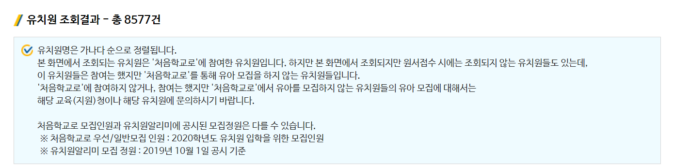 그리고 일단 처음학교로 홈페이지에 등록된 유치원만 8577건이 있고 이러한 것은 가나다 순으로 적용이 된다고 나오고 있습니다. 일단 처음학교로 모집인원과 유치원 알리미에 공시된 모집정원에 가끔씩 다를 수 있음을 알면 좋겠습니다.