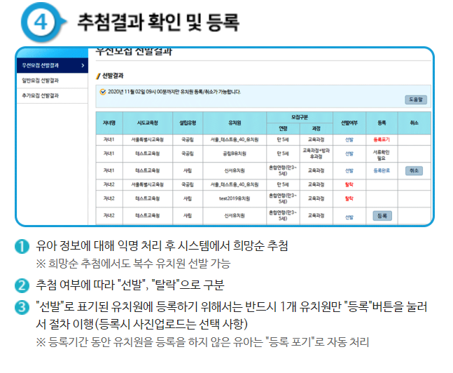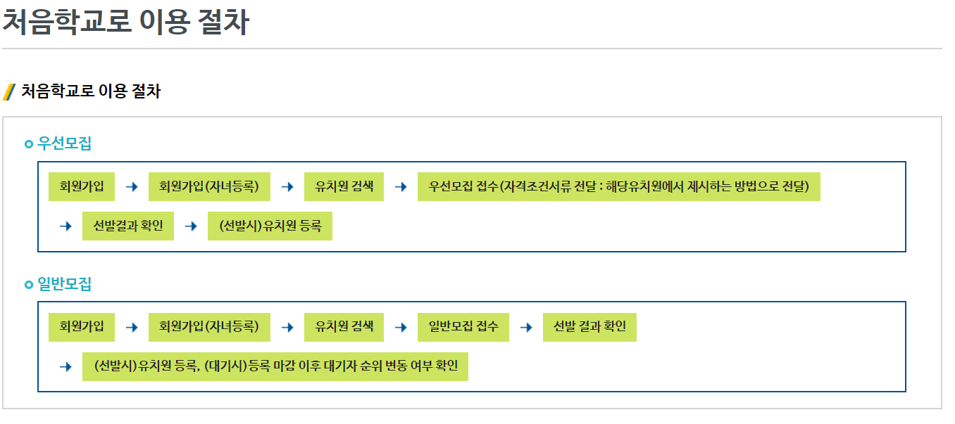 또한 일단 처음학교로 이용절차를 보시면 회원가입 회원가입 자녀 등록 유치원 검색 그리고 우선모집 접수 등으로 보시면 되겠습니다. 선발 결과도 확인하실 수가 있고요.