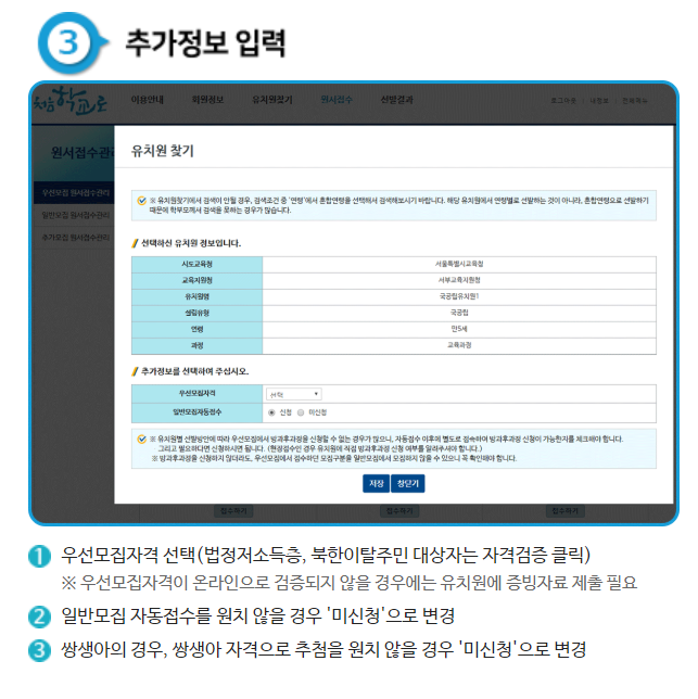 유치원 찾기 이후에 추가 정보 입력이 있는데요. 하나씩 알아보겠습니다. 일반적으로는 지역, 설립유형, 연령, 과정 설정 후 조회하고 그리고 희망하는 것을 선택 후 유치원 선택인데요. 그리고 일단 우선모집자격은 일반모집 자동접수를 원치 않는 경우 미신청으로 사용도 가능합니다.