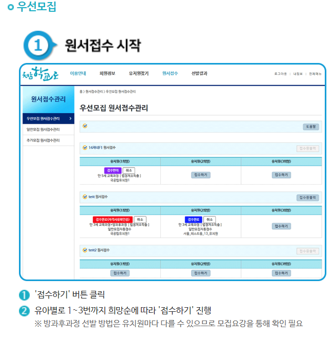 처음학교로 원서접수 시작을 하는 방법은 접수하기 버튼과 그리고 희망 순의 따라 진행이 됩니다.