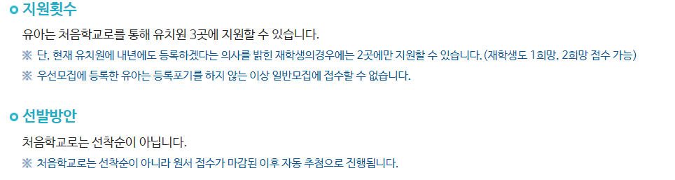 마지막으로 처음학교로에 대한 모든 정보를 확인해보았는데요. 일단 지원 횟수, 선발 방안, 자동접수, 대기자 관리, 쌍생아 경우 각종 확인을 해볼 수가 있음을 알려드립니다.
