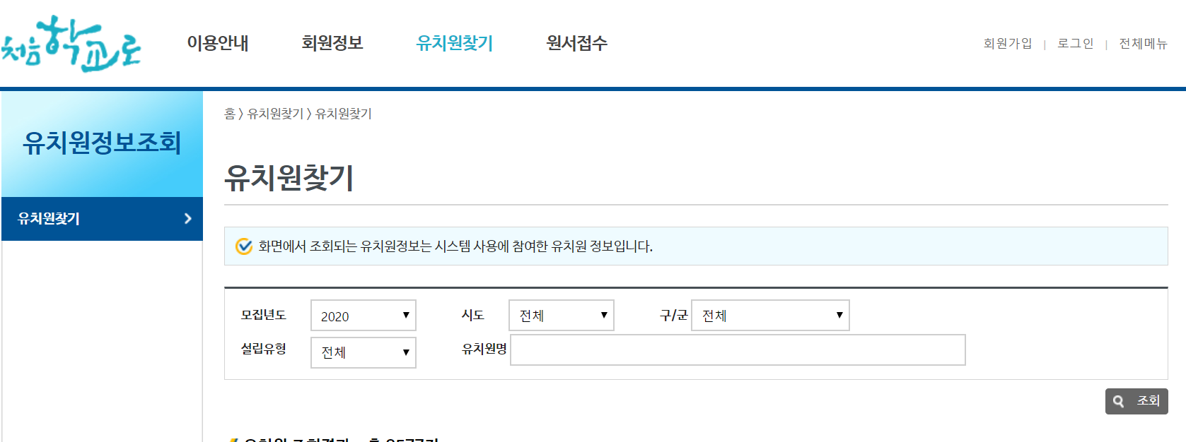 안녕하세요. 유치원 찾기 부분을 알아보도록 하겠습니다. 현제 모집 연도 그리고 시도. 그리고 구/군을 선택한 후에 국립이나 사립 부분을 선택하고 유치원명을 ㅊ직접 찾으셔도 되고 아니면 그냥 하셔도 됩니다.