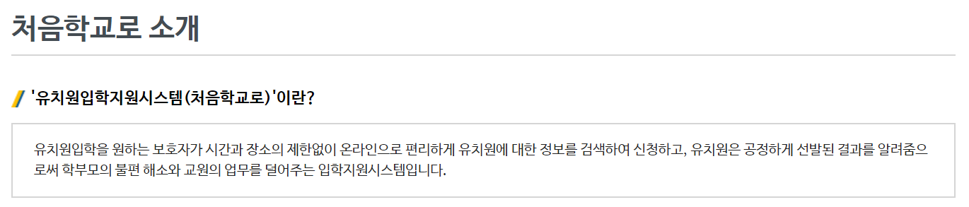 처음학교로 소개를 하자면 일단 유치원 입학 지원시스템으로 유치원 입학을 보호자가 시간과 장소가 제한 없이 편리하게 지원하고 넣는 부분을 말할 수가 있습니다.