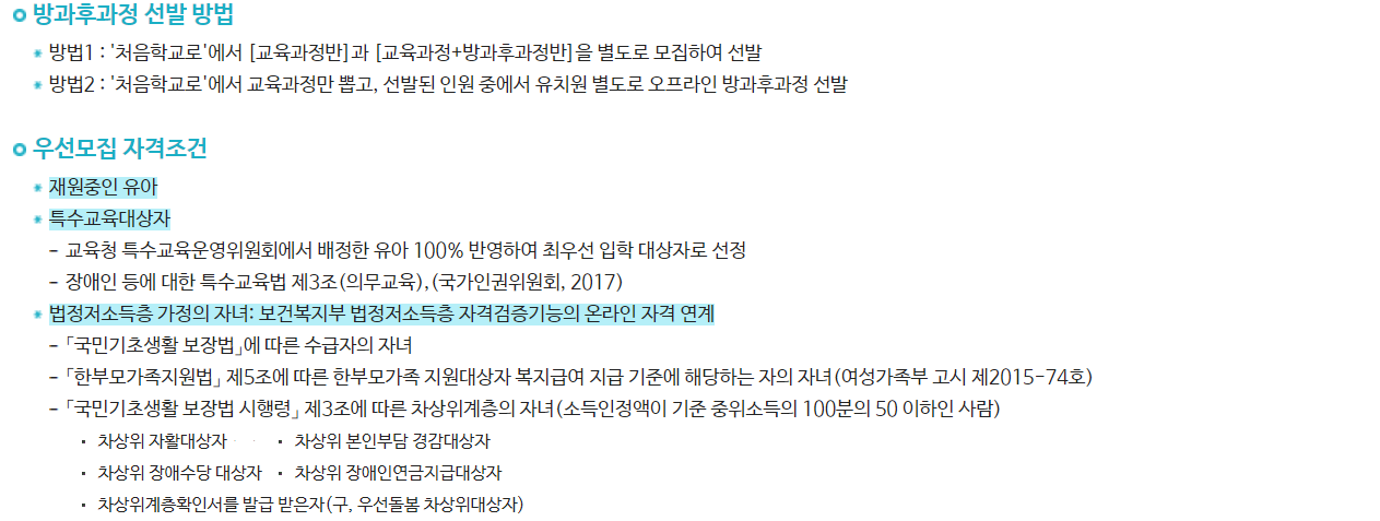 또한 우성 모집 자격조건 등이 있는데요. 위의 사진을 보시면 아시겠지만 일단 교육청 특수교육운영위원회에서 배정한 유아 100% 반영하여 최우선 입학 대상자로 책정이 됩니다.