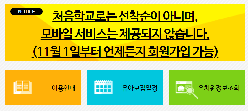 오늘부터 회원가입이 가능하고 그리고 모바일 서비스는 제공하지않고 이 홈페이지만 일단 가능합니다. 가장 꿀 정보는 유아모집일정과 그리고 유치원 정보조회 부분이 정말 필요한 부분입니다.
