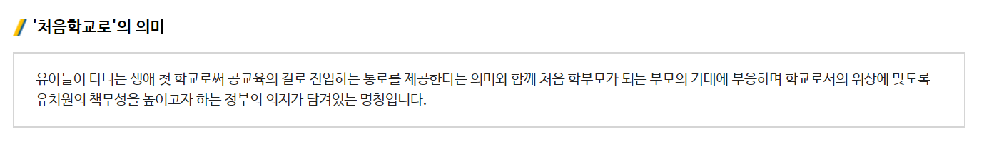 일단 처음학교로 의미를 보자면 유아들이 다니는 생에 첫 학교를 일단 공교육의 길로 집 입을 하는 통로로 하기 위한 준비를 해주겠다는 것이고 이로 맞추어서 유치원의 책무성을 많이 높이고자 하는 의지가 담겨 잇는 고유의 명칭이 바로 처음학교로 진정한 의미라고 보면 되겠습니다.
