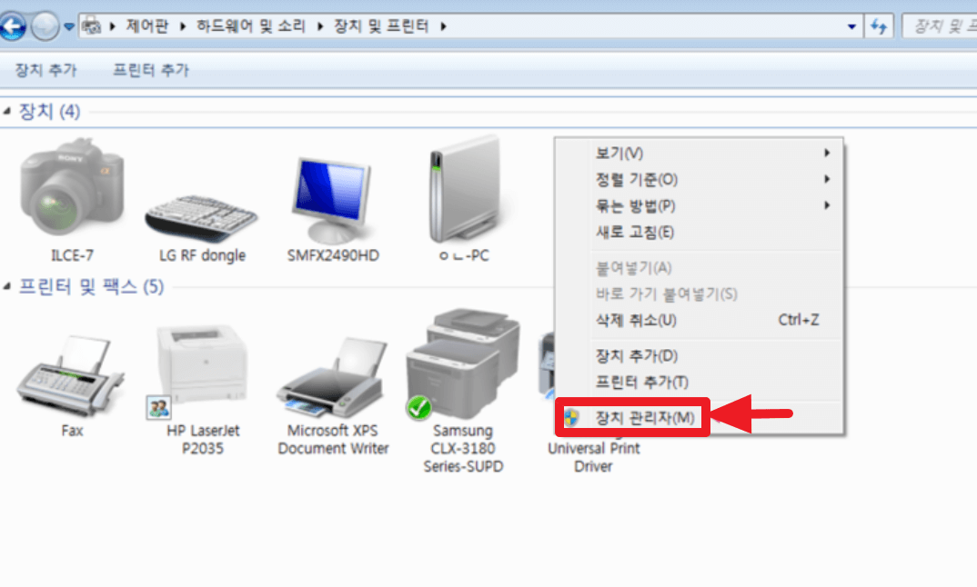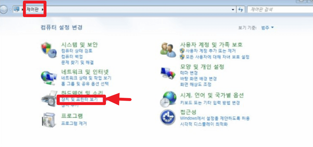 일단 윈도우 제어판을 접속을 합니다. 그리고 일단 하드웨어 및 소리라고 하는 메뉴를 선택하시고 그 밑에 보게 되면 장치 및 프린터 보기가 있습니다. 솔직히 여기까지는 확인하는 게 따라 하기 쉽습니다. 그대로 진행해보겠습니다.