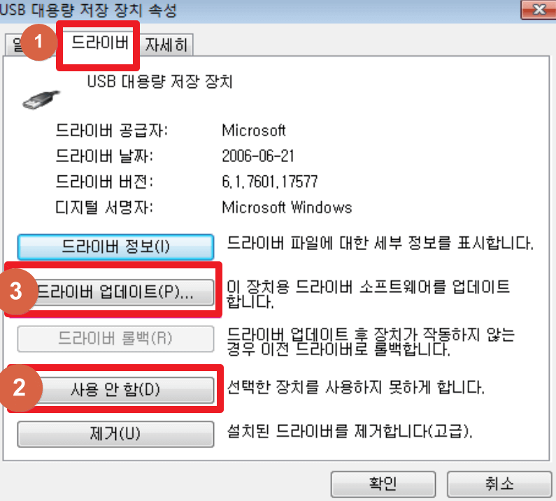 usb 인식이 안될때 주로 에러가 난 부분이 이쪽 부분인데요. 일단 장치 속성 부분에서 드라이버를 클릭하세요. 그리고 사용 안 함 부분을 헤지 시켜줍니다. 또한 마지막으로 드라이버 업데이트가 필요로 합니다. 그렇게 되면 기존 인식이 안되던 부분에서 해결이 됩니다.