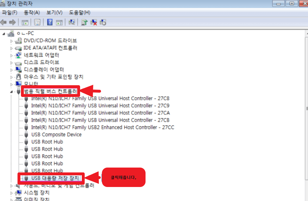 장치 관리자 화면이 뜨게 되는데 이때 범용 직렬버스 컨트롤러 부분을 클릭하신 뒤 클릭하게 되면 또한 아래로 많은 메뉴가 뜨게 됩니다. 이때 usb 루트 허브 부분을 지나면 usb 대용량 저장 장치가 나오게 됩니다. 이 부분을 클릭해서 들어가고 설정만 하게 되면 이제 usb 인식 부분을 조정해줄 수가 있습니다.
