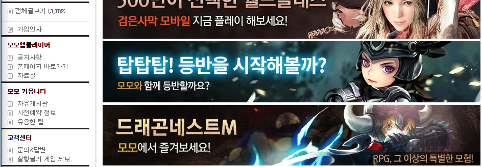 왼쪽의 자료실 게시판이 보이시나요. 모모앱플레이어 다운로드하기 위해서는 홈페이지 바로가기 밑에 자료실로 들어가시면 되겠습니다. 이동후에 보면 실제로 가장 평이 좋은 구버전도 있긴 합니다. 하지만 속도는 빠를지 모르나 최근의 게임들의 최적화가 된 것은 3.29.0 버전이기에 이걸 받는 게 가장 좋습니다.