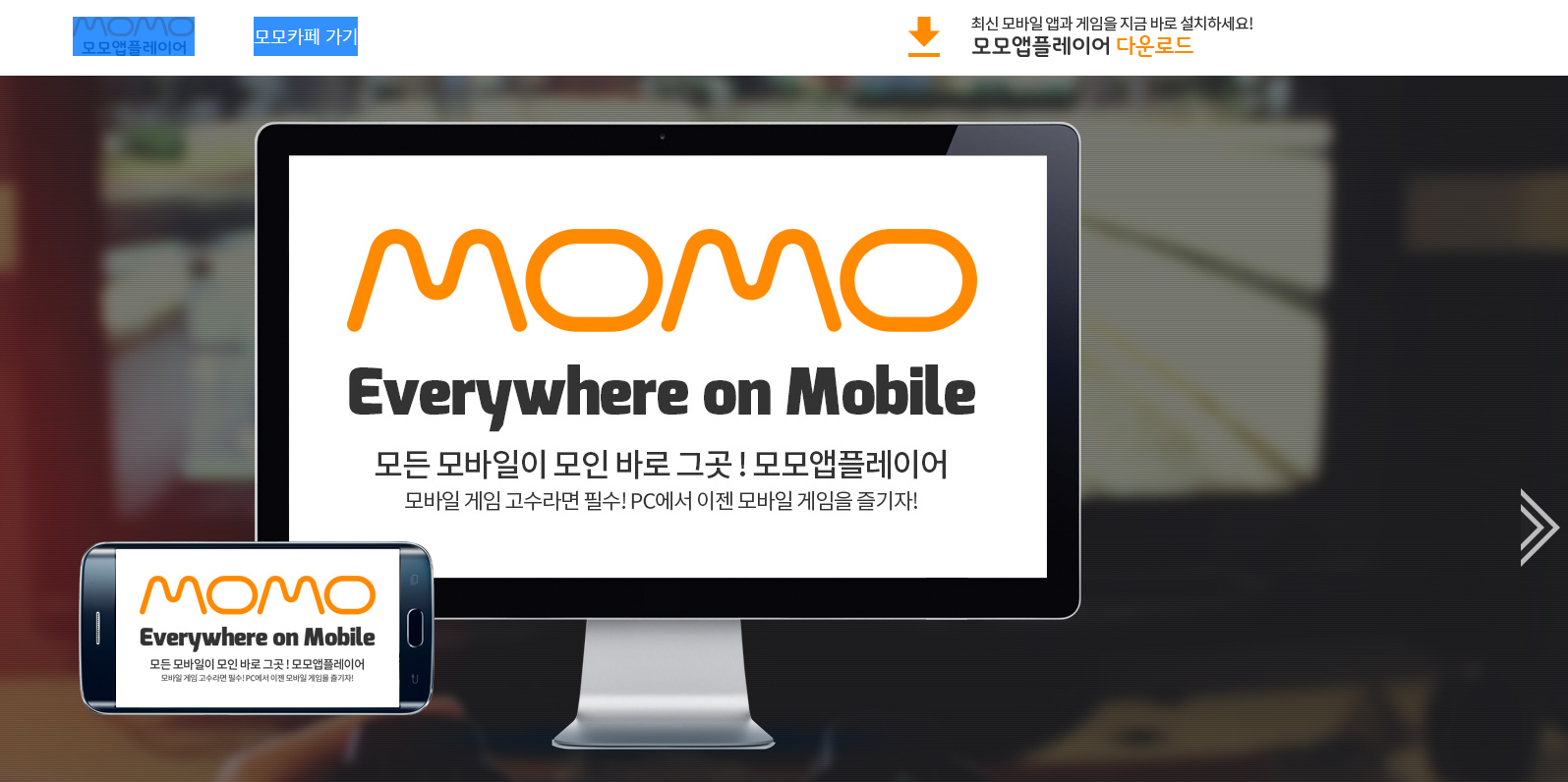설명을 간단히 드리자면 일단 주소로 가시던지 아니면 각종 포털에서 모모앱플레이어라고 치시면 사이트들이 나오게 되는데요. 일단 이러한 모습이 되겠습니다. 그냥 심플해서 너무 뭐가 없긴 합니다. 단순 랜딩페이지 같이 보이기는 합니다.