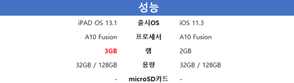 - 2. 램 1GB 추가 기존 6세대에서 2GB 램 용량이 아이패드 7세대에서는 3GB로 1GB 늘어났다. 애플이 기본적으로 램을 추가하는 것에 보수적인 편인데, 보급형 기종에 램 3GB를 넣어줬다는 사실은 다소 고무적이다.
