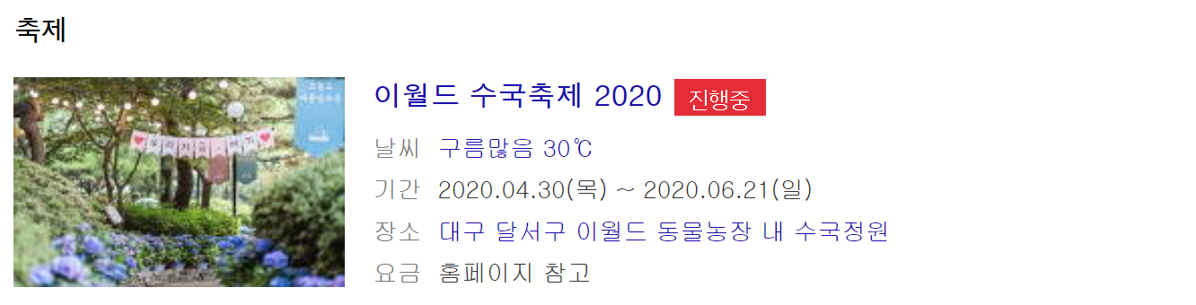 6월 축제 가볼만한 곳 이번에는 대구편을 말씀드릴께요. 이곳에서 우리가 가장 잘 알고 있는 이월드의 수국축제 입니다. 일단 이곳은 이란 날씨가 매우 더운데요 벌써 6월이지만 30도를 넘나드는 온도입니다. 장마가 끝나고 나면 상상 하기도 싫은데요. 빨리꼭 가보시기를 바래요.