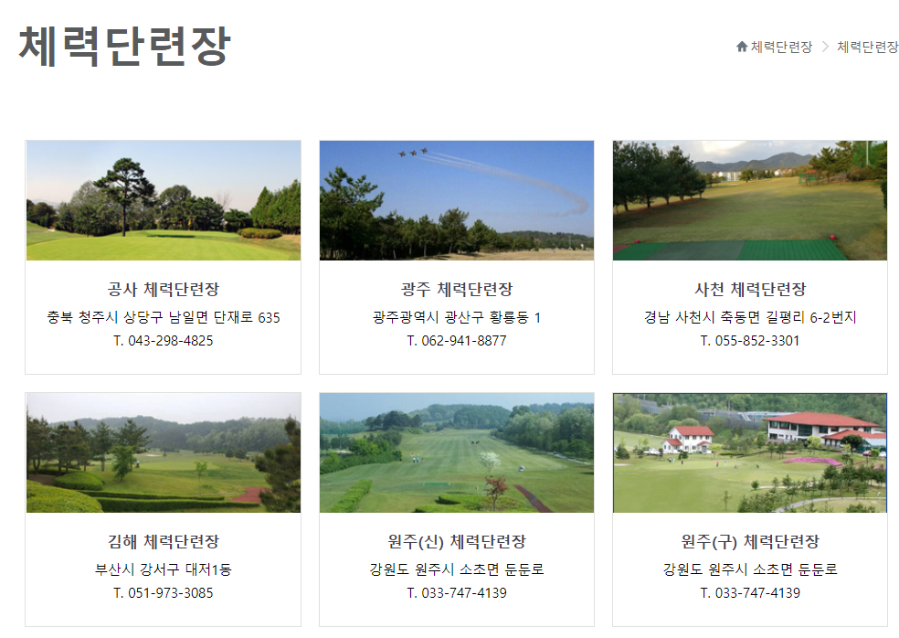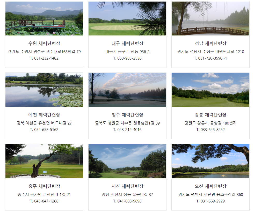 여러분 일단 추가적으로 공군은 우리나라 전지역에 걸쳐서 있는데요. 추가적으로 필드가 있는 곳을 더 말씀드리자면 수원, 대구, 성남, 예천, 청주, 강릉, 충주, 서산, 오산 체력단련장이 있으며 거기에 따른 주소와 전화번호가 있으니 문의 이후에 해보시면 됩니다.
