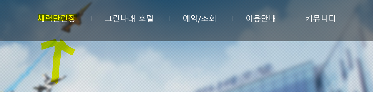 일단 공군 홈페이지에서 가장 상단의 체력단련장이라는 메뉴를 선택하고 들어가주세요.