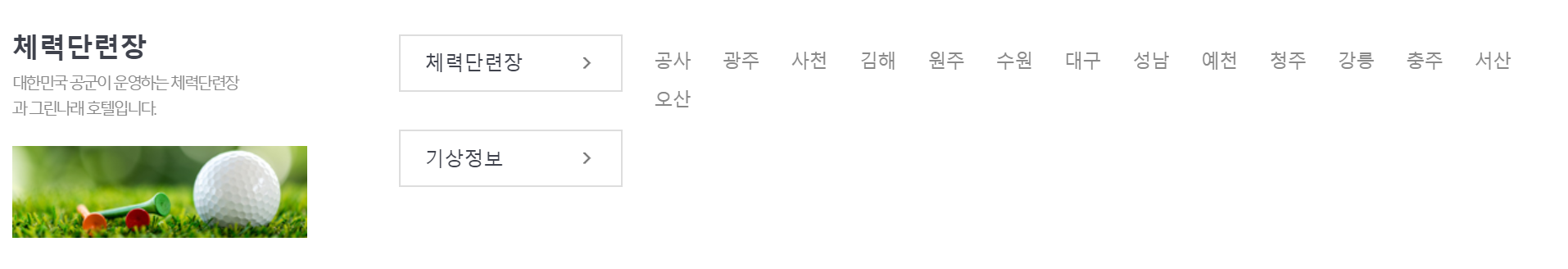 공사, 광주, 사천, 김해, 원주, 수원, 대구, 예천, 청주, 강릉, 충주, 서산, 오산 체력단련장이 위치하고 있으면 기상정보는 누르면 확인을 해볼수가 있습니다.