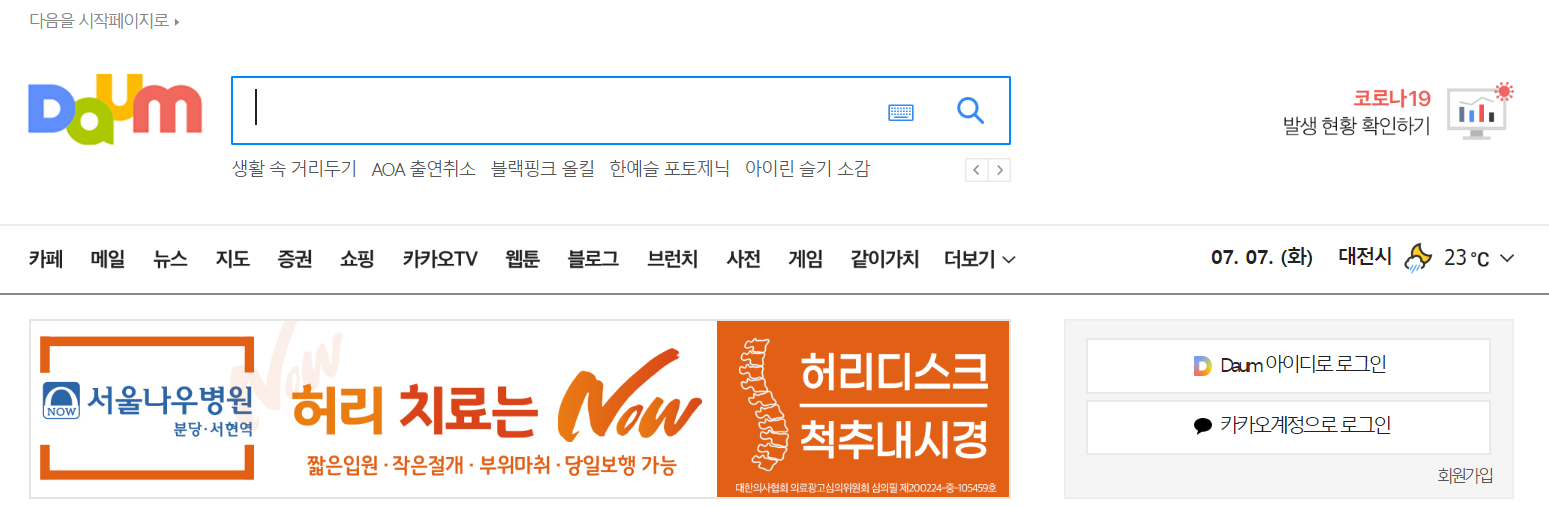 일단 다음을 먼저 접속을 하셔 보세요. 그리고 네이버나 줌 그리고 빙등에서 다음을 시작페이지로 이제 지정을 해보도로록 할텐데요. 즐겨찾기나 다음을 시작페이지로 바꾸기 위한 바탕화면 아이콘등등 다양한 부분이 있지만요. 일단 일단 웹브라우저 통해서 설정하기법 알아보겠습니다.