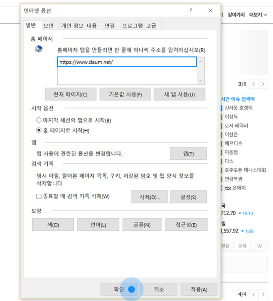 다음을 시작페이지로 설정하기 위해서는 바로 [ daum.net ] 입니다.