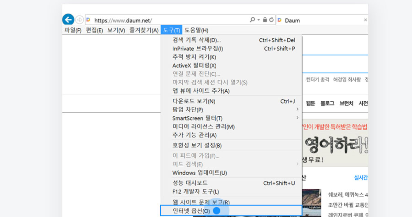 인터넷 익스플로러에서 다음을 시작페이지로 설정 해보겠습니다.